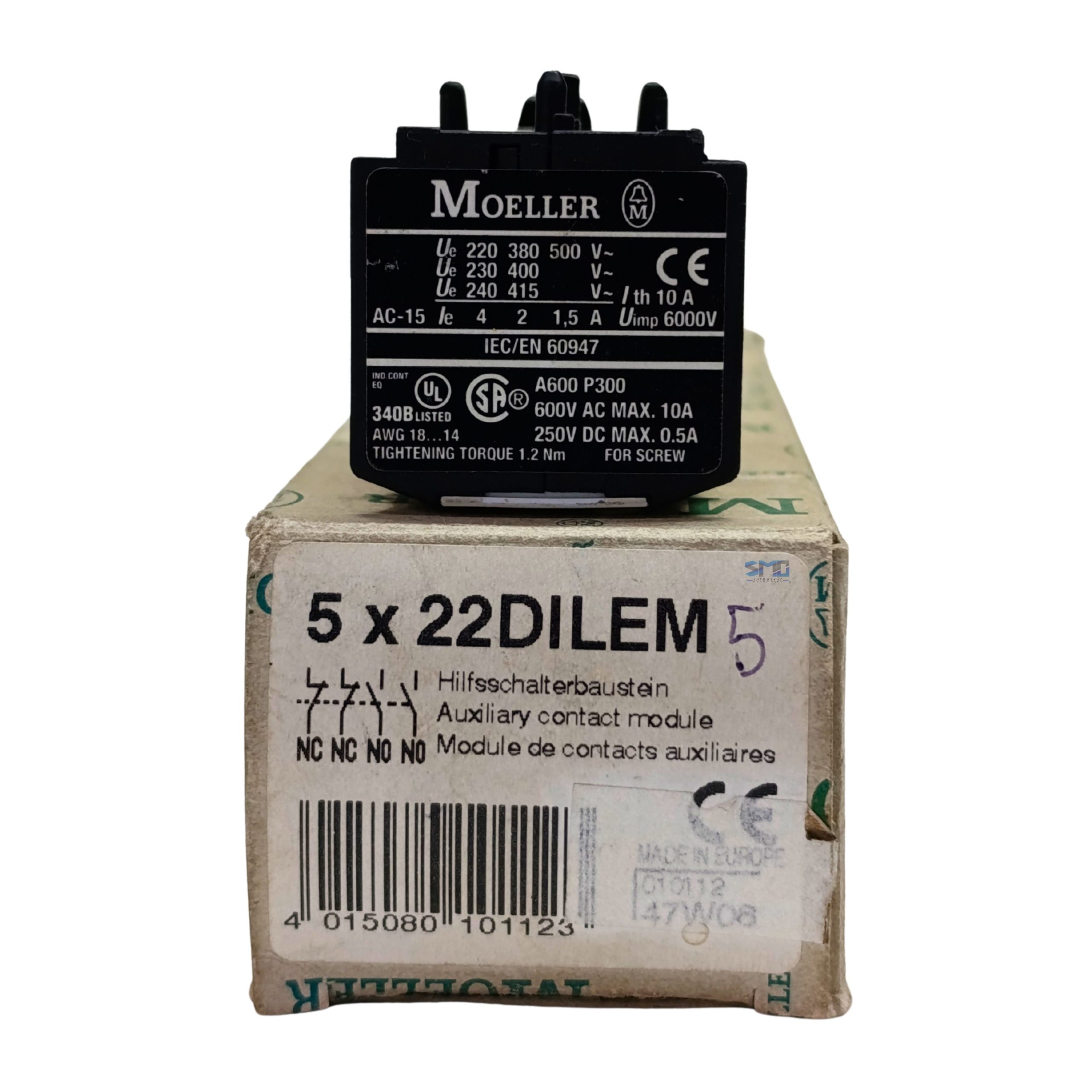 Kit contendo 5 unidades de bloco de contato Moeller, modelo 22DILEM, produto novo, ideal para reposição, montagem de painéis elétricos e aplicações em comandos industriais. Os blocos de contato Moeller são reconhecidos pela qualidade, durabilidade e confiabilidade, garantindo excelente desempenho em sistemas de automação e controle.