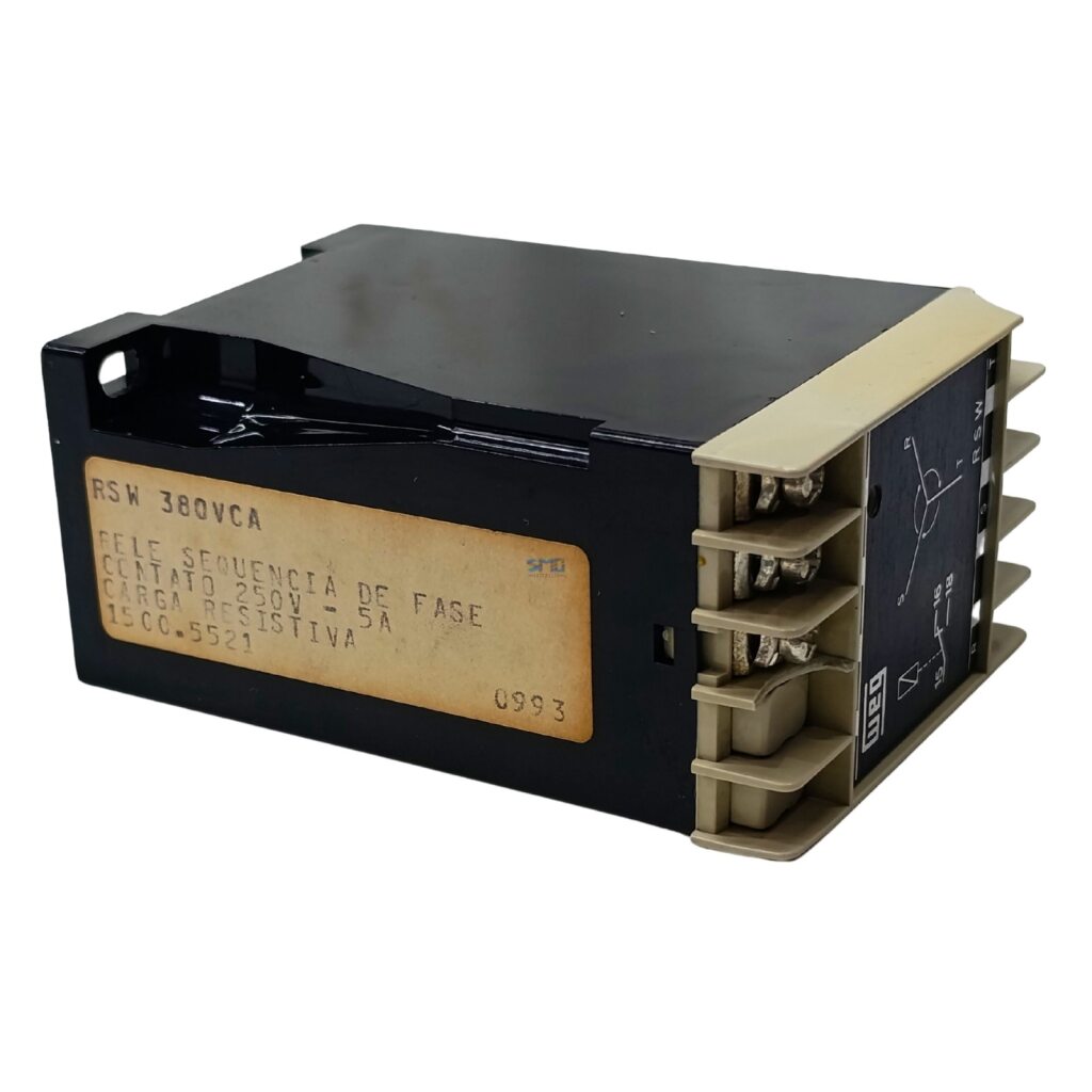 Relé Sequencia de Fase Weg, Contato 250V - 5A, modelo RSW 380Vca, seminovo, armazenado adequadamente e em perfeitas condições de uso. Ideal para reposição, manutenção ou expansão de sistemas industriais, garantindo desempenho confiável e longa durabilidade.